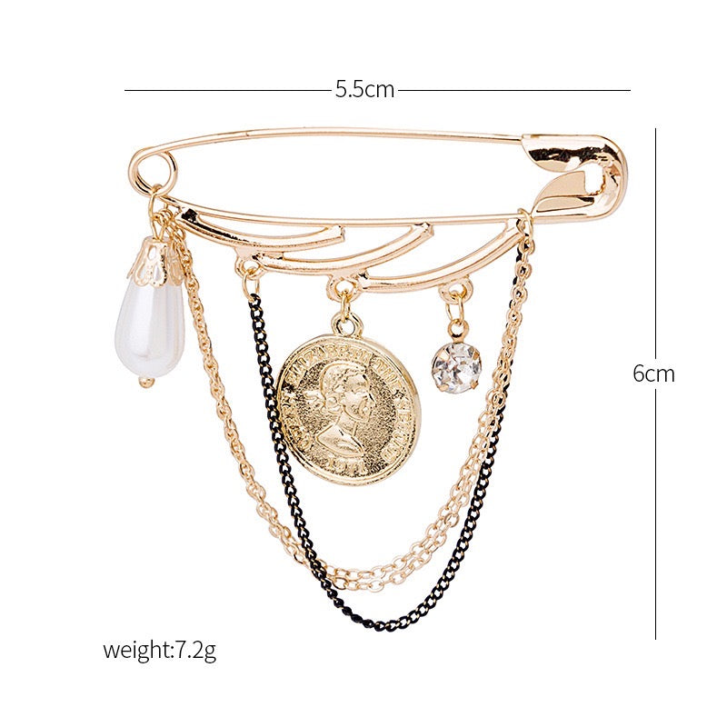 Big Coin and Pearl with Chain Tassels Brooch