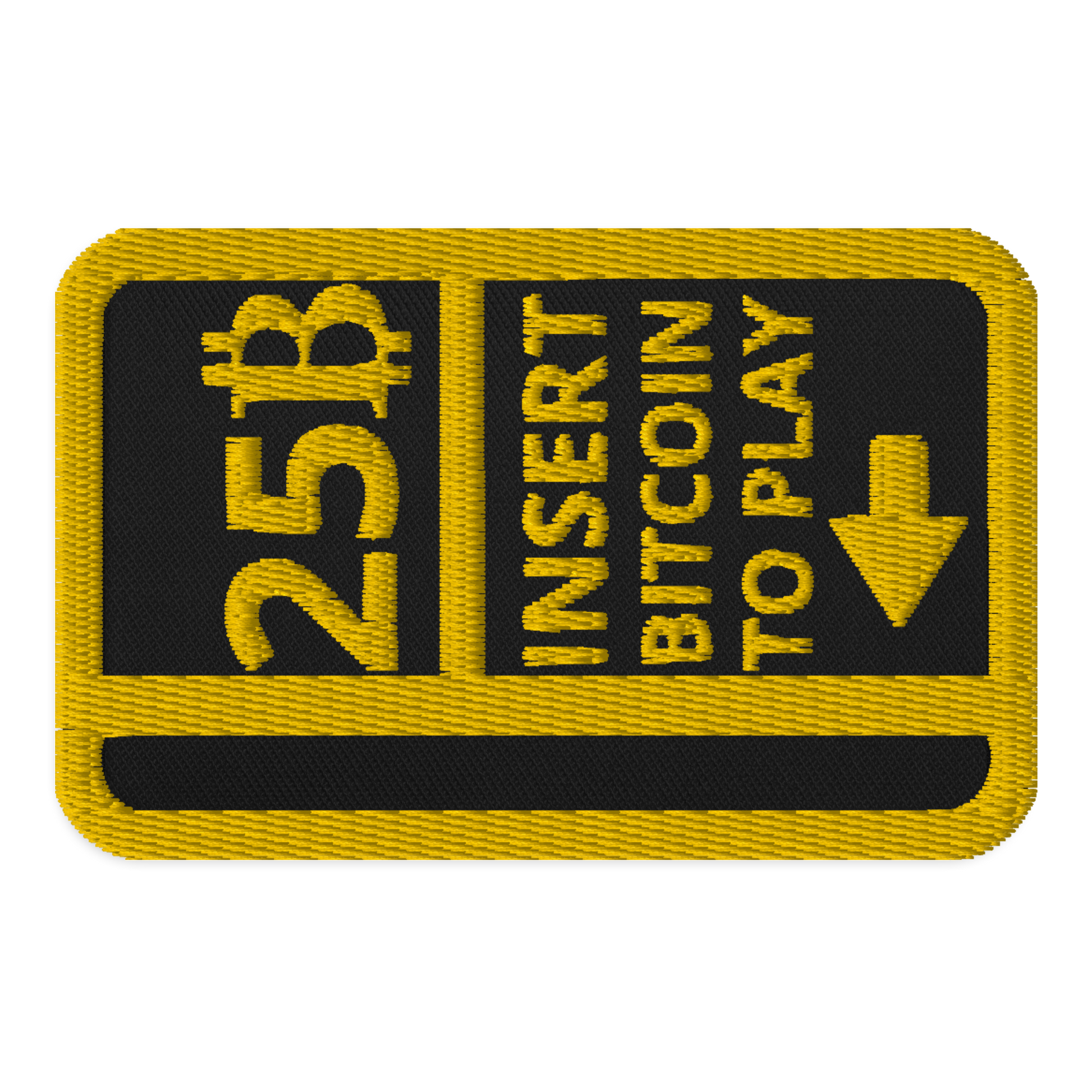 An embroidered patch featuring the words Insert Bitcoin To Play, akin to the old arcade machines you would see back in the day that cost a quarter for three lives or one run, etc. You can still find some machines, but most gaming is done at home. The world has changed quite a lot.