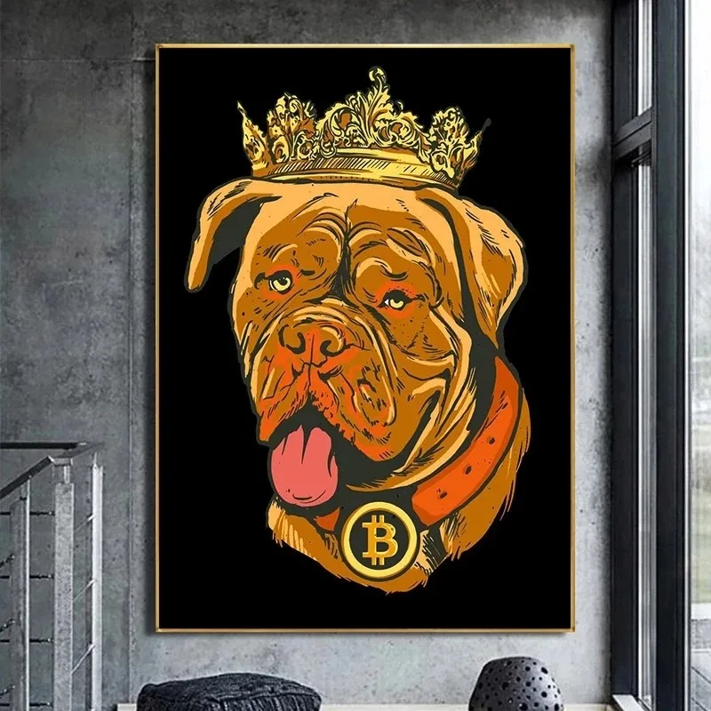 Neon Gold Bitcoin Bull Crypto Canvas Painting Pug Bitcoin Poster and Print Funny Wall Art Picture for Living Room Home Decor